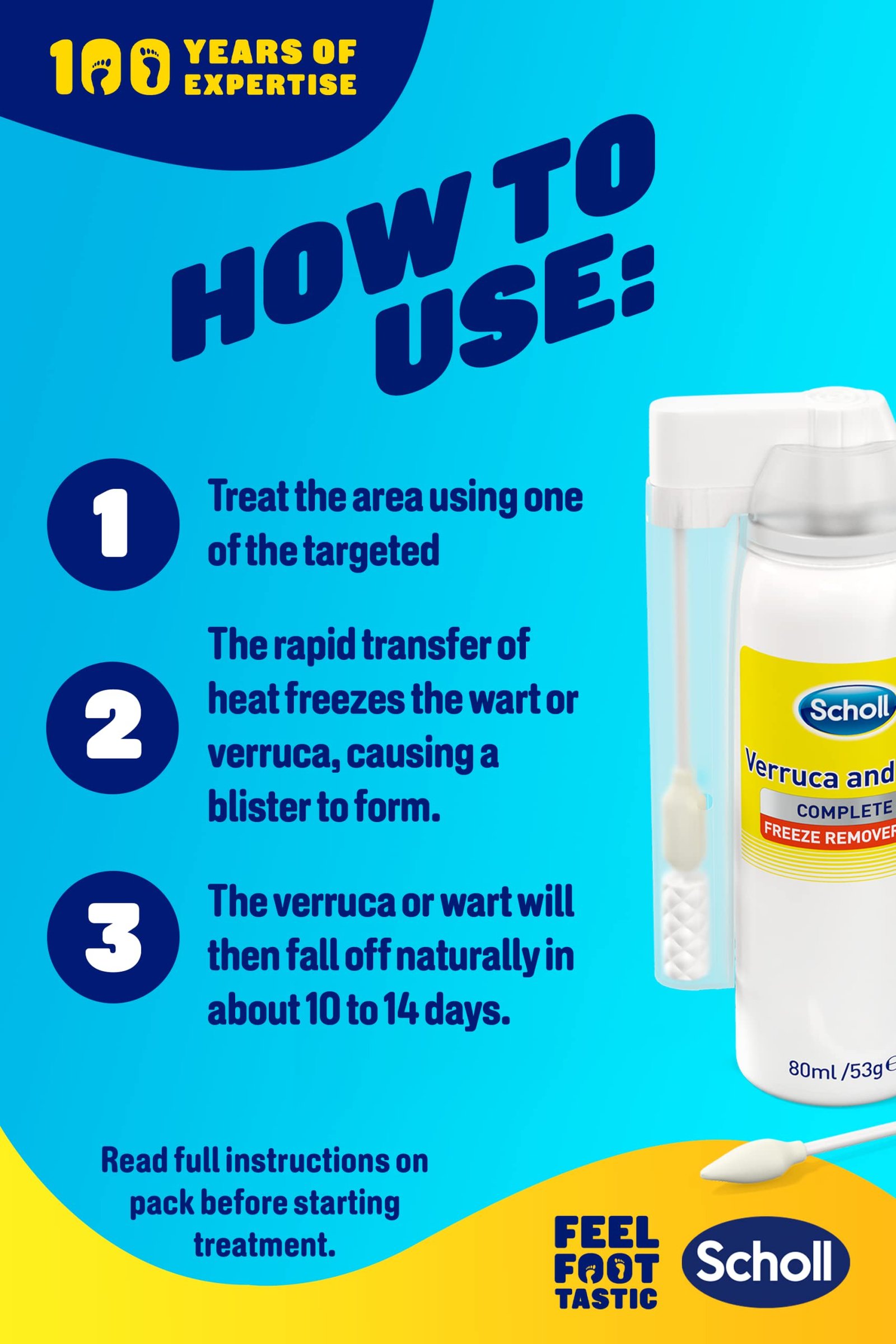 • EASY TO USE AND EFFECTIVE: Scholl verruca and wart remover freeze treatment starts to work in 40 seconds and works by rapidly freezing the wart or verruca. One single treatment can be sufficient however, for more stubborn or persistent warts or verrucas, additional applications may be required. Always read the instructions, if symptoms persists, please consult a Healthcare professional